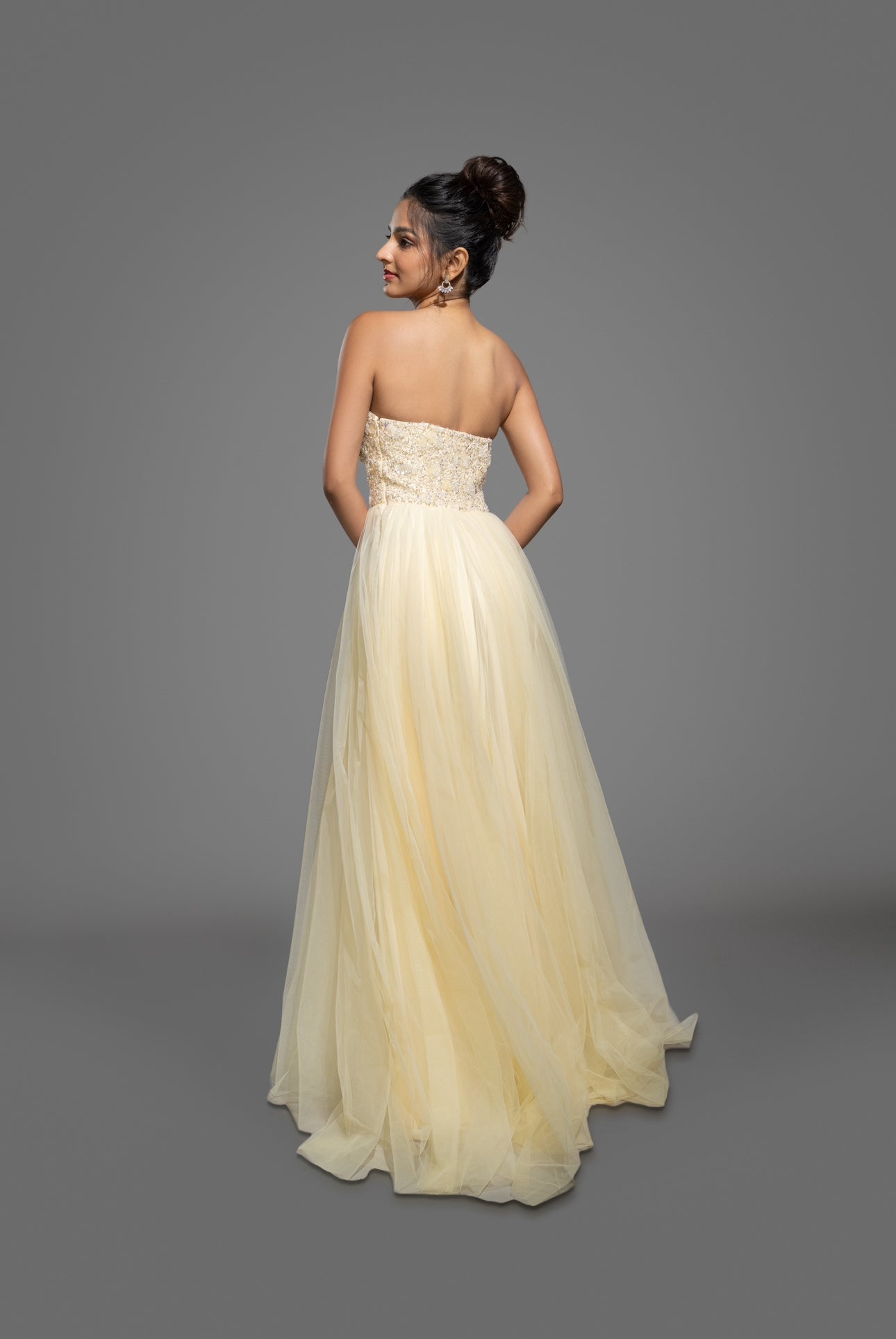 This strapless gown radiates ethereal elegance with its sunlit yellow tulle layers flowing into a dreamy silhouette. The fitted bodice, encrusted with golden sequins and delicate embellishments, adds a touch of sparkle while the soft, cascading skirt creates a fairytale-like aura. Perfect for gala evenings, receptions, or modern red-carpet moments, this gown embodies light, grace, and timeless sophistication.