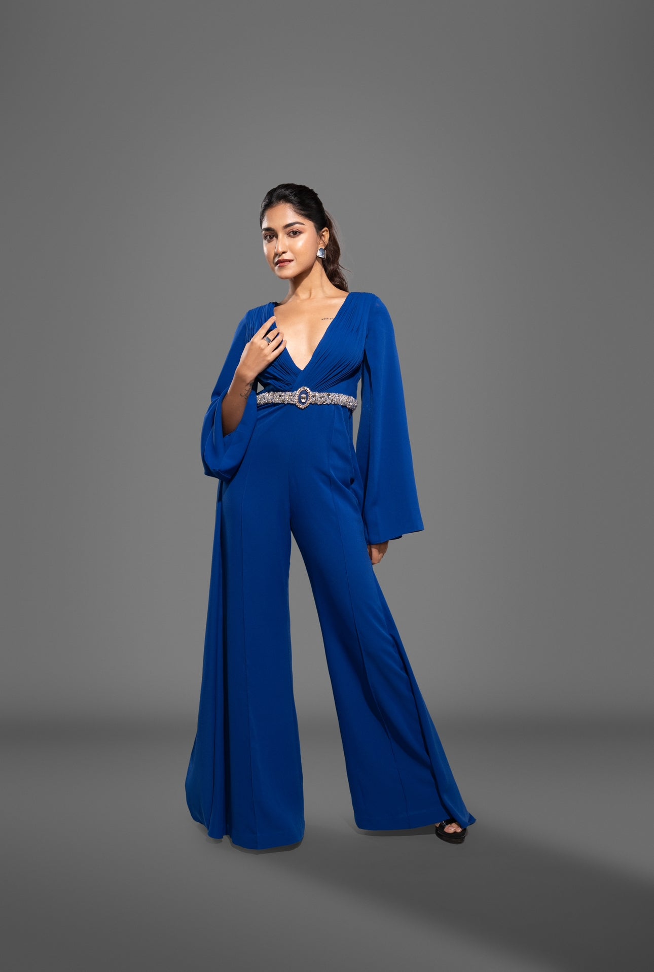 A bold wide-leg jumpsuit in deep sapphire blue, designed with flowy bell sleeves and a plunging neckline. The cinched embellished belt adds definition and glamour, making it a power look that transitions seamlessly from cocktails to high-fashion events.